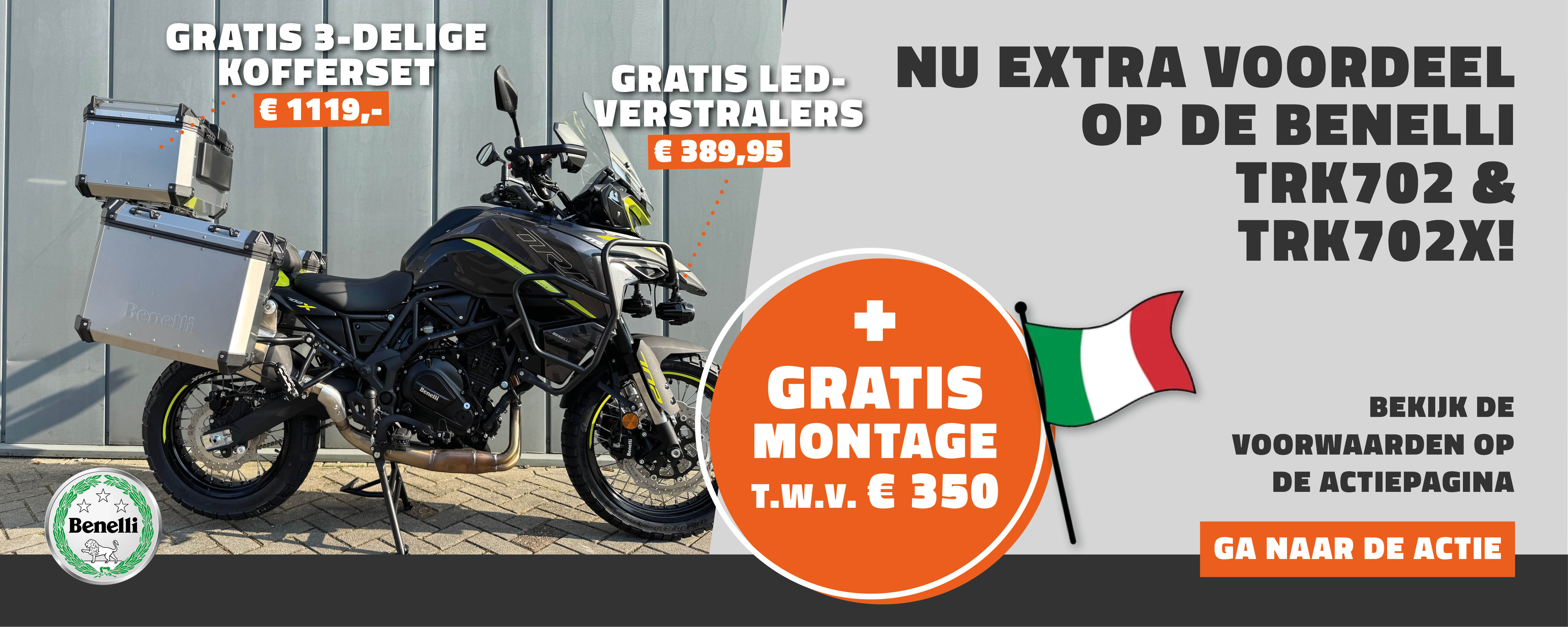 De Benelli 702X en 702 zijn in prijs verlaagd! Nu tijdelijk met gratis 3-delige kofferset (t.w.v. €1119), LED-verstralers (t.w.v. €389,95) en gratis montage(t.w.v. €350).