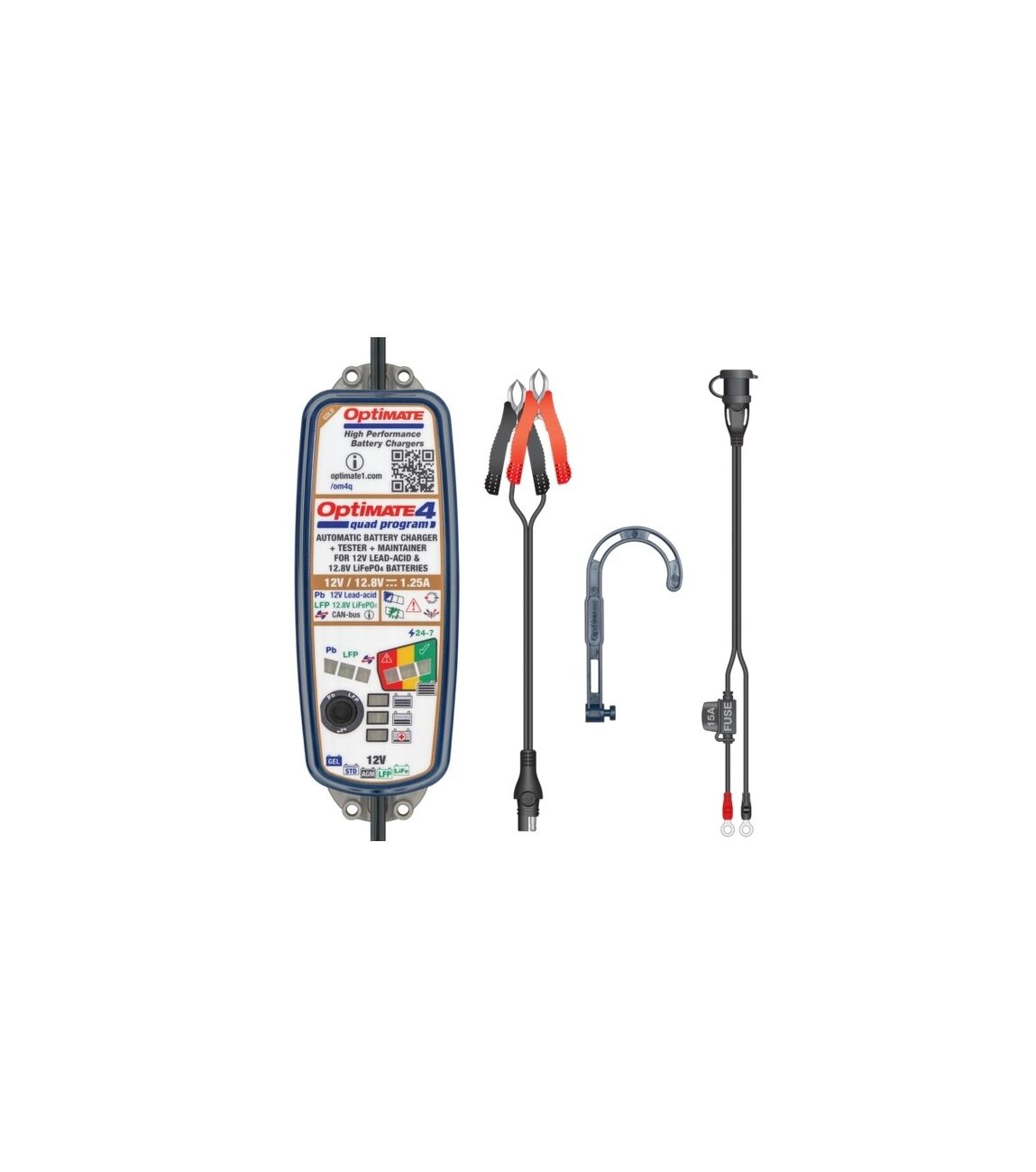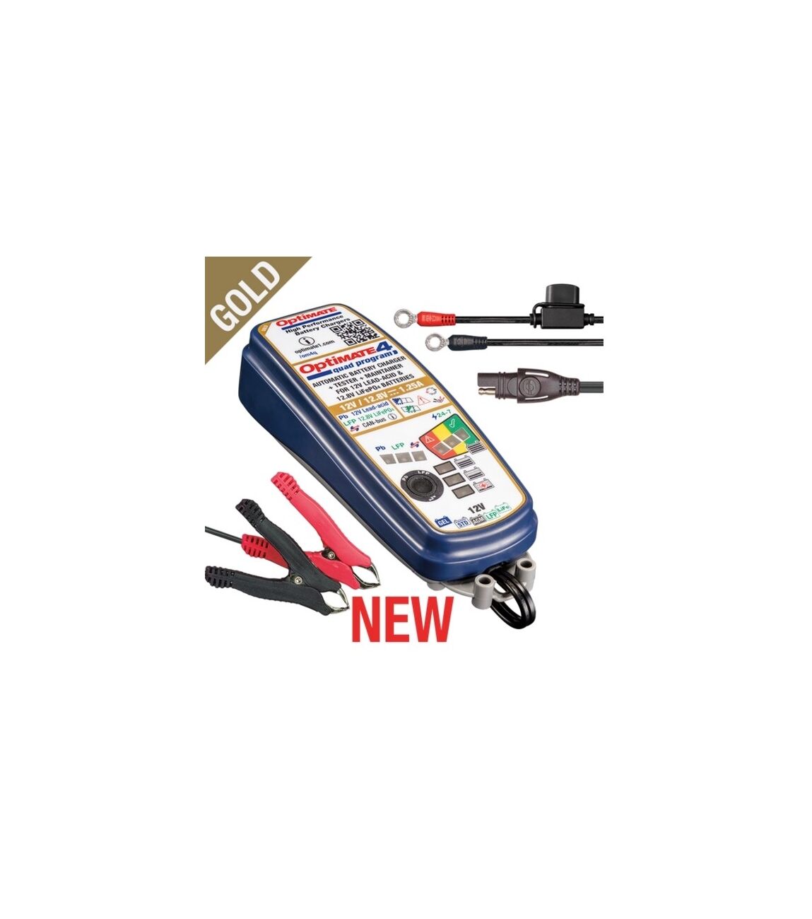 De OptiMate 4 Quad Program Gold serie van Tecmate is een 9-staps 12V / 12,8V 1,25A afgedichte accu besparende oplader en onderhouder.