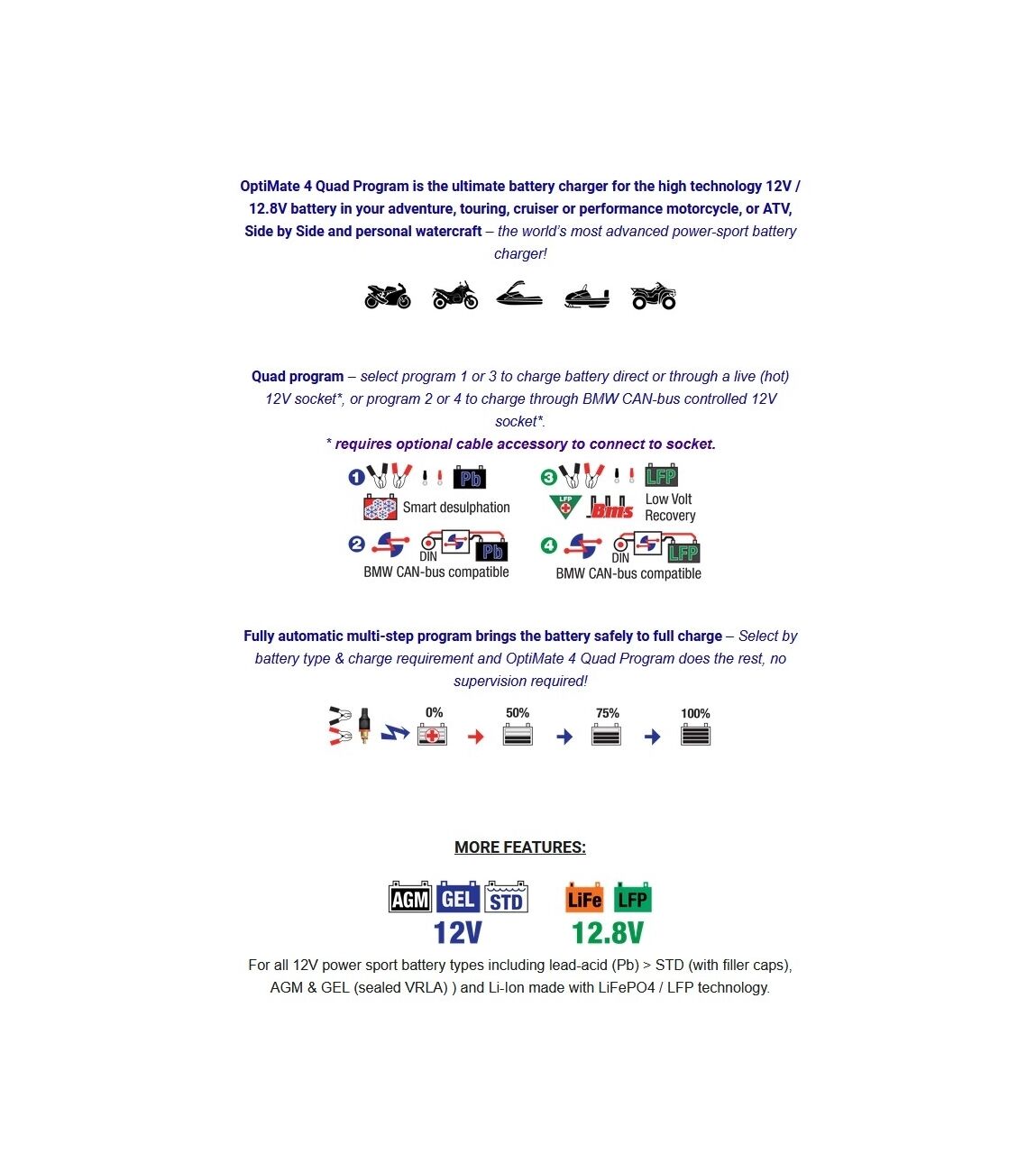- Selecteer op accutype en oplaadbehoefte en het OptiMate 4 Quad-programma doet de rest, geen toezicht vereist!
